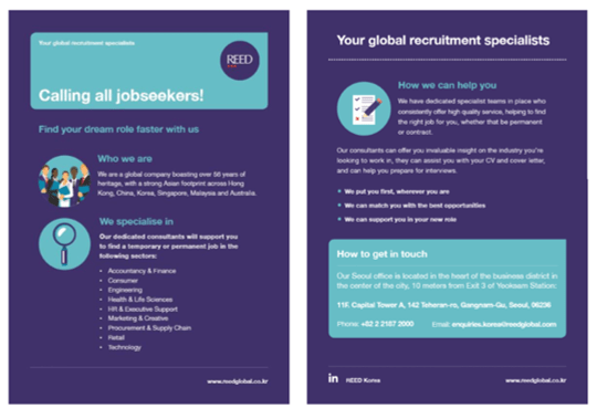 The below document is a double sided A5 flyer I put together for a careers fair REED were hosting in Korea. The copy reads: