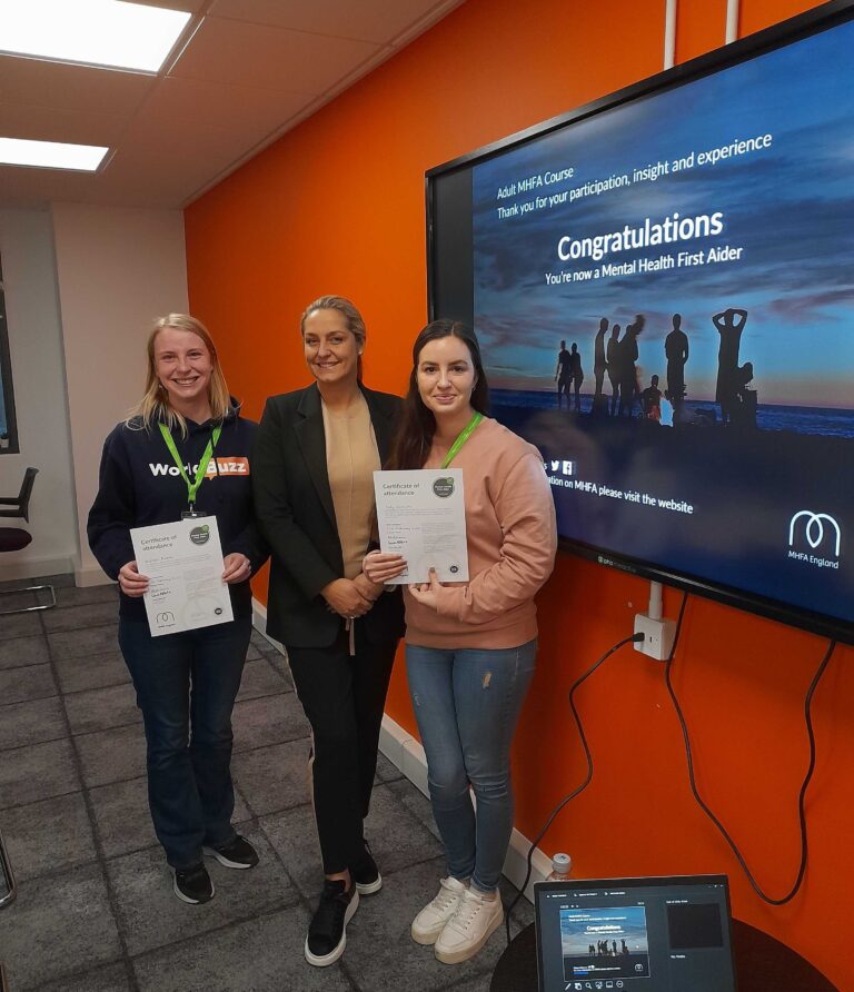 The two-day Mental Health First Aid England course taken by our ‘WorkBuzzers’ covered topics such as mental health (influences i.e., stress, stigma and discrimination, and recovery), depression, suicide, substance misuse, anxiety disorders, self-harm, eating disorders, personality disorders, and psychosis.